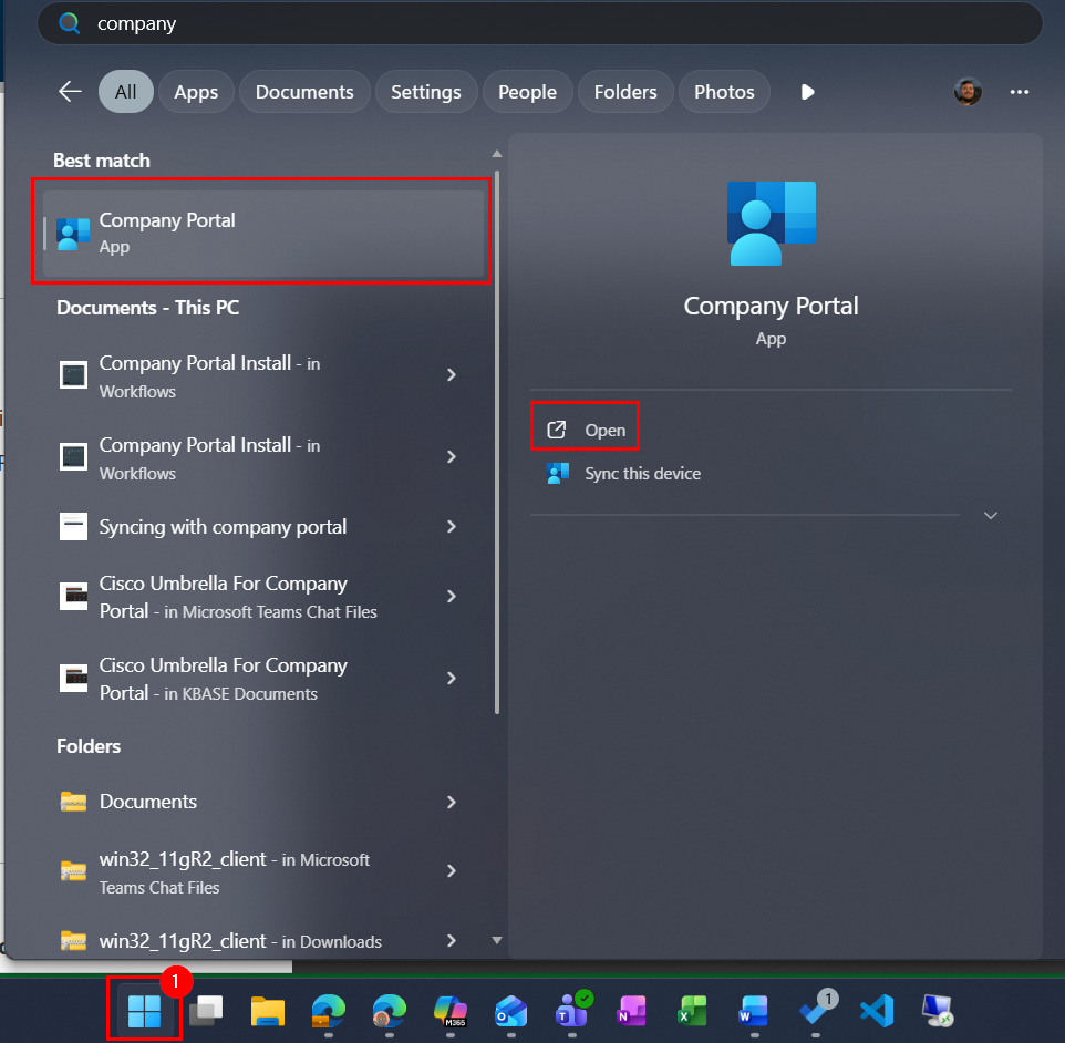 - Click Start (Windows icon) and type Company Portal. Open the Company Portal app from the search results.